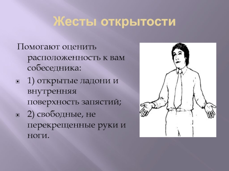 1) руки раскрыты, ладони направлены вверх — доброжелательность и искренность;