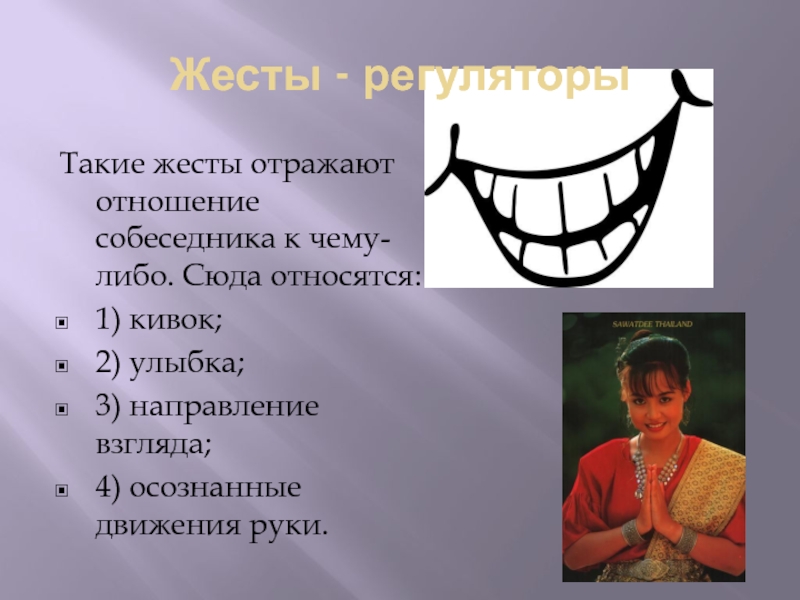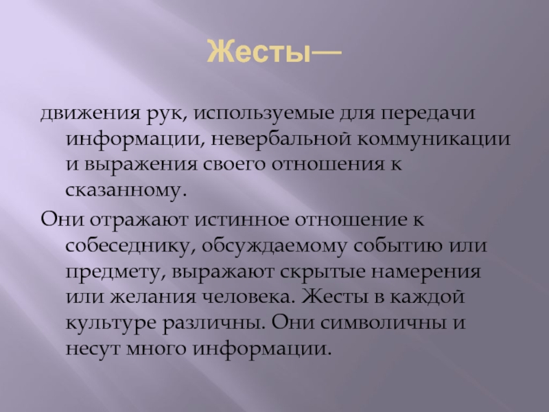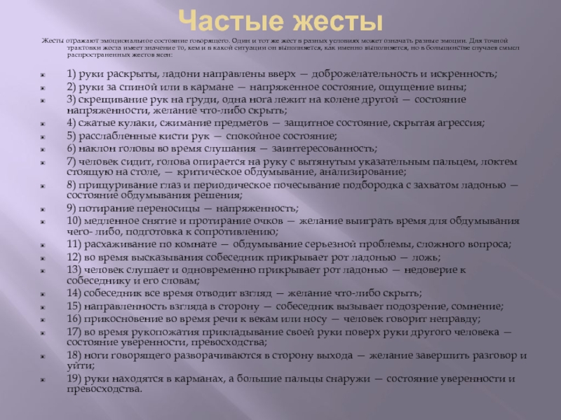 Они отражают истинное отношение к собеседнику, обсуждаемому событию или предмету, выражают скрытые намерения или желания человека. Жесты в каждой культуре различны. Они символичны и несут много информации.