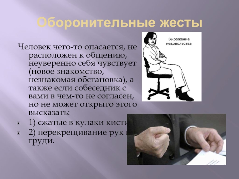 4) сжатые кулаки, сжимание предметов — защитное состояние, скрытая агрессия;