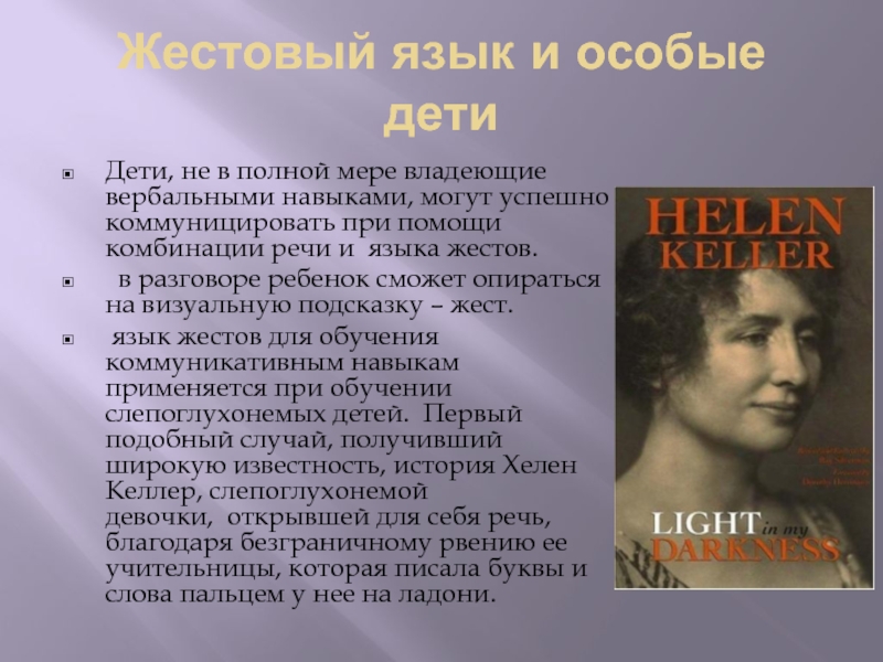 язык жестов для обучения коммуникативным навыкам применяется при обучении слепоглухонемых детей. Первый подобный случай, получивший широкую известность, история Хелен Келлер, слепоглухонемой девочки, открывшей для себя речь, благодаря безграничному рвению ее учительницы, которая писала буквы и слова пальцем у нее на ладони.