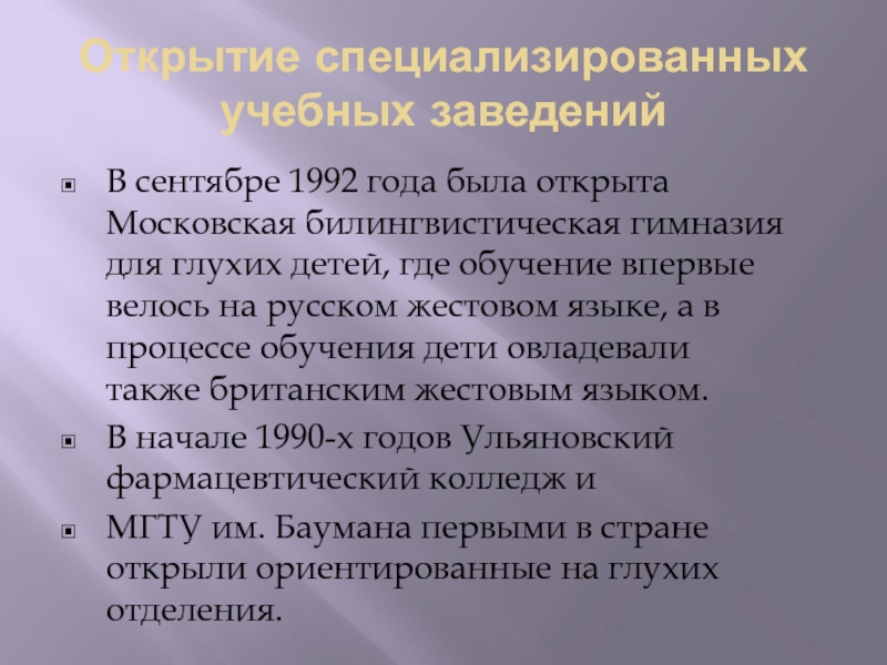 гимназия для глухих детей, где обучение впервые велось на русском жестовом языке, а в процессе обучения дети овладевали также британским жестовым языком.