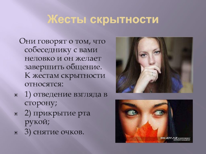 15) направленность взгляда в сторону — собеседник вызывает подозрение, сомнение;
