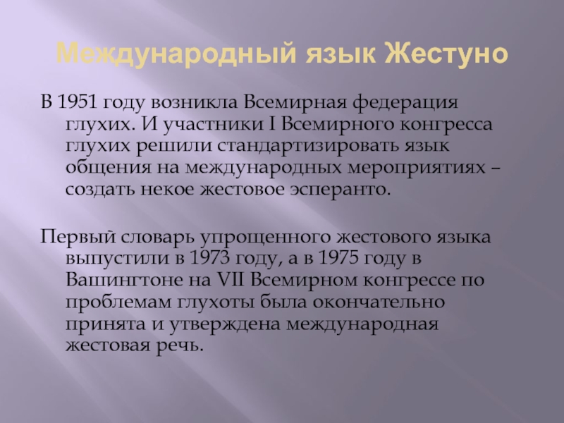 Первый словарь упрощенного жестового языка выпустили в 1973 году, а в 1975 году в Вашингтоне на VII Всемирном конгрессе по проблемам глухоты была окончательно принята и утверждена международная жестовая речь.