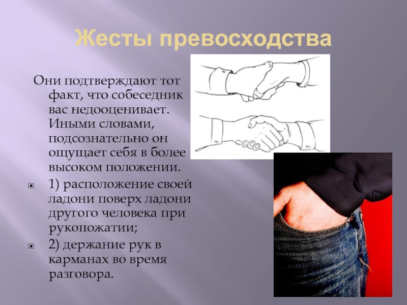 19) руки находятся в карманах, а большие пальцы снаружи — состояние уверенности и превосходства.