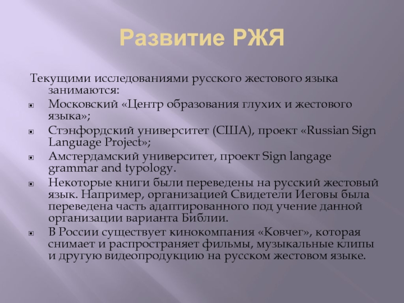 Стэнфордский университет (США), проект «Russian Sign Language Project»;