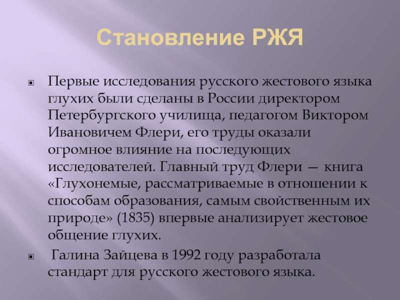 директором Петербургского училища, педагогом Виктором Ивановичем Флери, его труды оказали огромное влияние на последующих исследователей. Главный труд Флери — книга «Глухонемые, рассматриваемые в отношении к способам образования, самым свойственным их природе» (1835) впервые анализирует жестовое общение глухих.