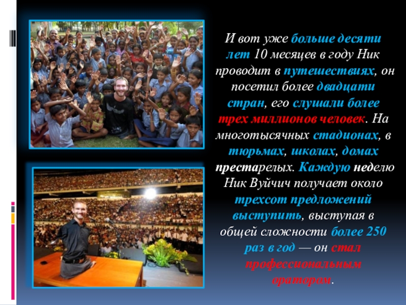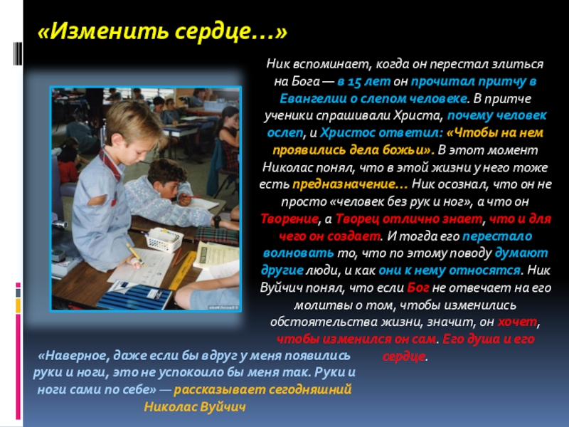 «Наверное, даже если бы вдруг у меня появились руки и ноги, это не успокоило бы меня так. Руки и ноги сами по себе» — рассказывает сегодняшний Николас Вуйчич