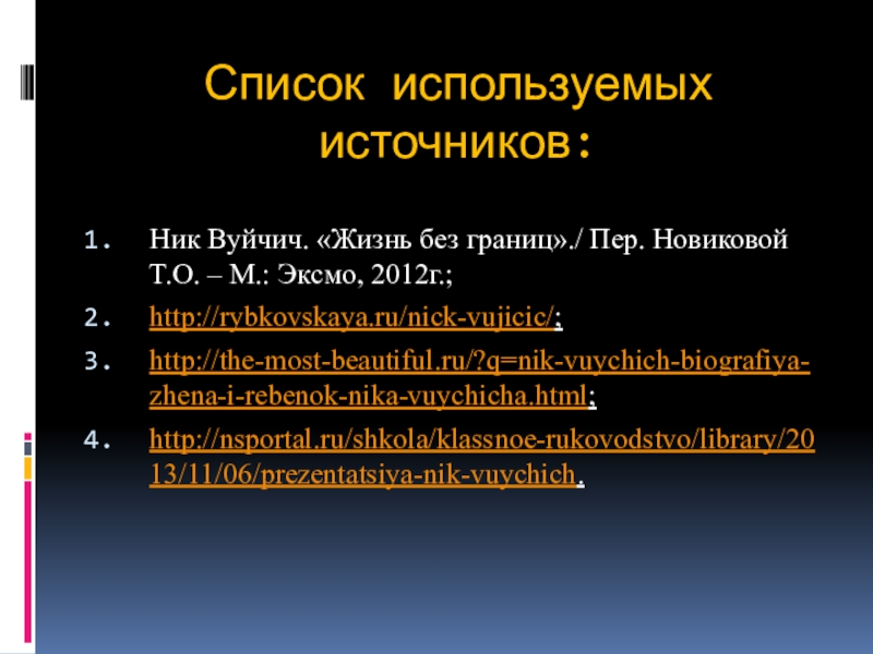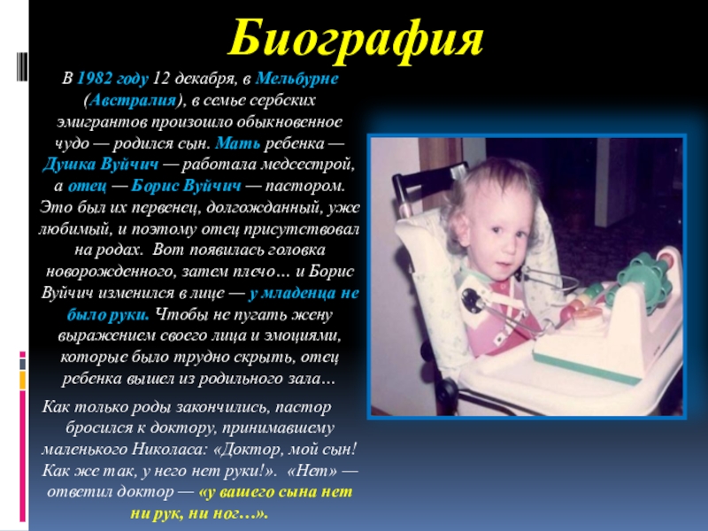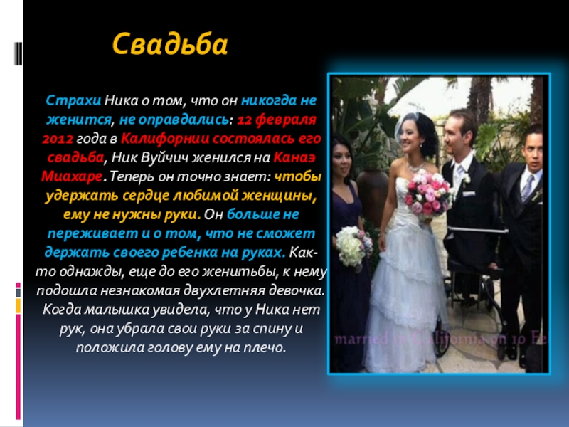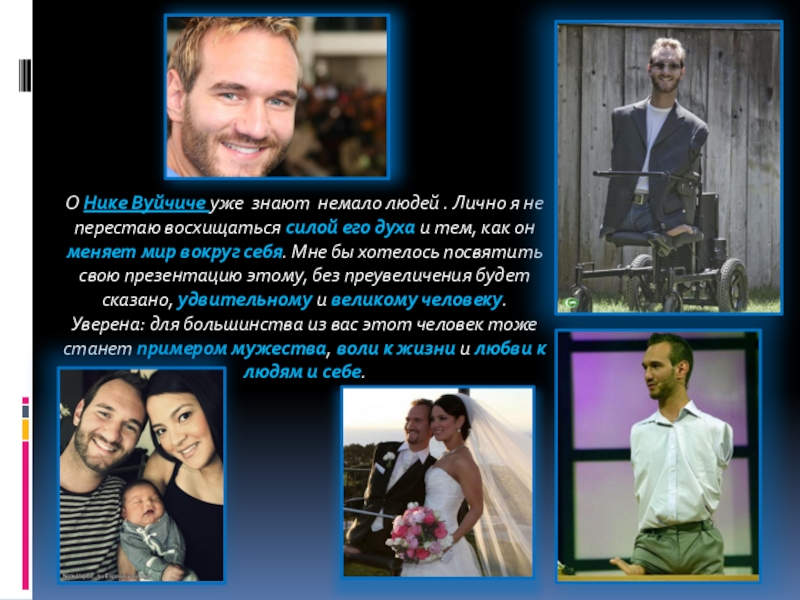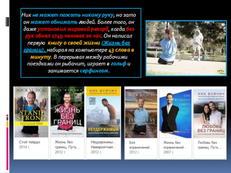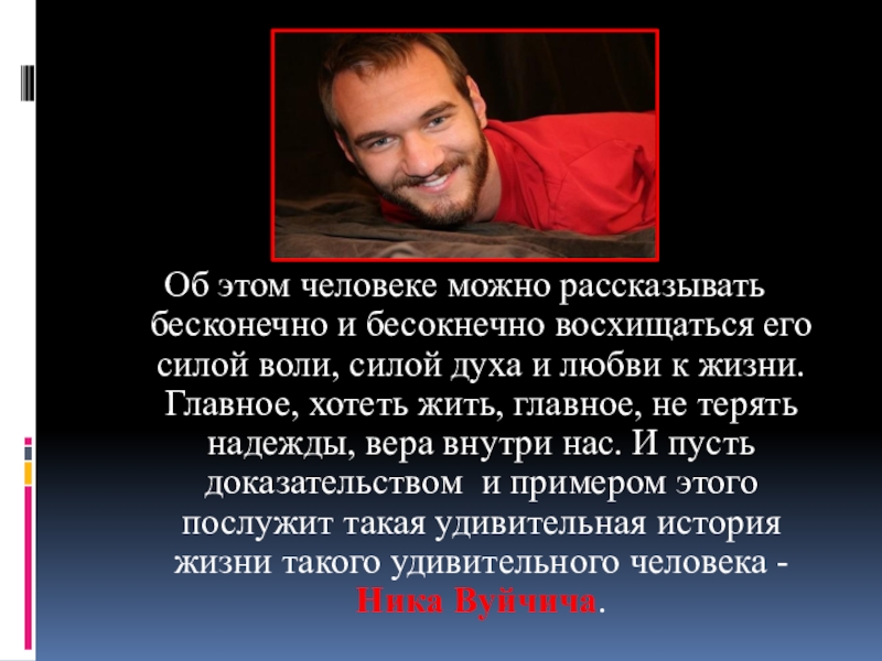 После этого Ник уже никогда не пробовал свести счеты с жизнью, но вопрос «почему я не такой, как все, и зачем мне дана жизнь» оставался для него открытым. Он не понимал, кем он может работать, сможет ли жениться, как возьмет за руку своего ребенка. Как-то раз мама прочитала ему книгу про тяжело больного человека, который силой своего духа вдохновлял других. После прочтения книги мама сказала сыну: