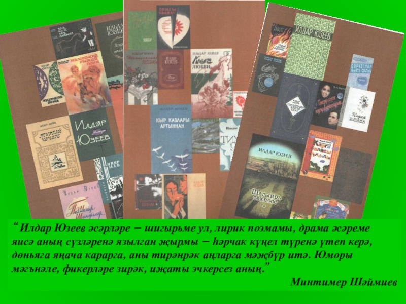 Илдар Юзеев иҗатын ике канат һавада тотып тора. Аның берсе – лирика, икенчесе – юмор. Кайсы гына поэмасын алып карама, анда сагыш, лирика, моң чыңлый. Аның шигъри моңнары драматур-гиясендә дә колач җәя, лирикасы белән юморы, бергә үрелеп, тама-шачы күңелендә җылы хәтирәләр калдыра