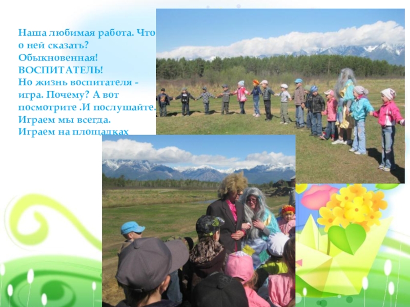 Наша любимая работа. Что о ней сказать? Обыкновенная! ВОСПИТАТЕЛЬ! Но жизнь воспитателя - игра. Почему? А вот посмотрите .И послушайте. Играем мы всегда. Играем на площадках