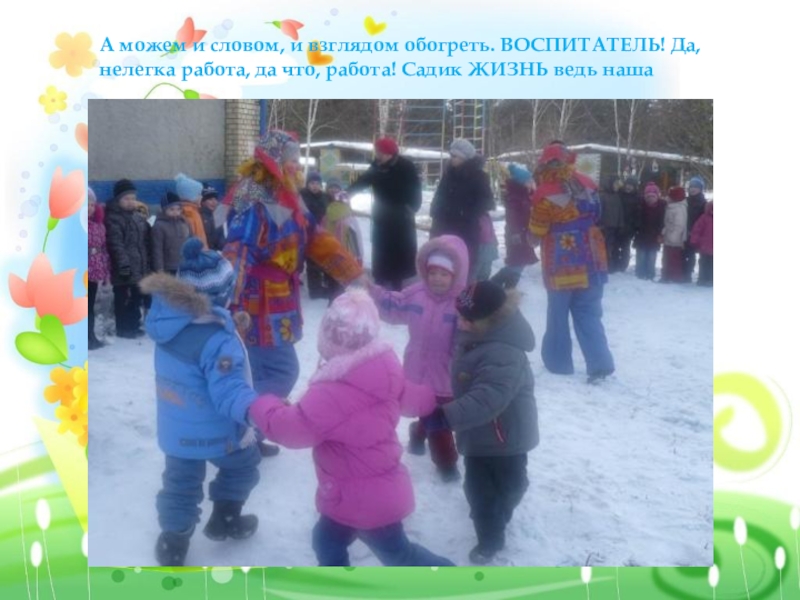 Слайд 11А можем и словом, и взглядом обогреть. ВОСПИТАТЕЛЬ! Да, нелегка работа,