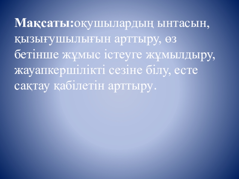 Слайд 2 Мақсаты:оқушылардың ынтасын, қызығушылығын арттыру, өз бетінше жұмыс істеуге жұмылдыру,жауапкершілікті сезіне білу,
