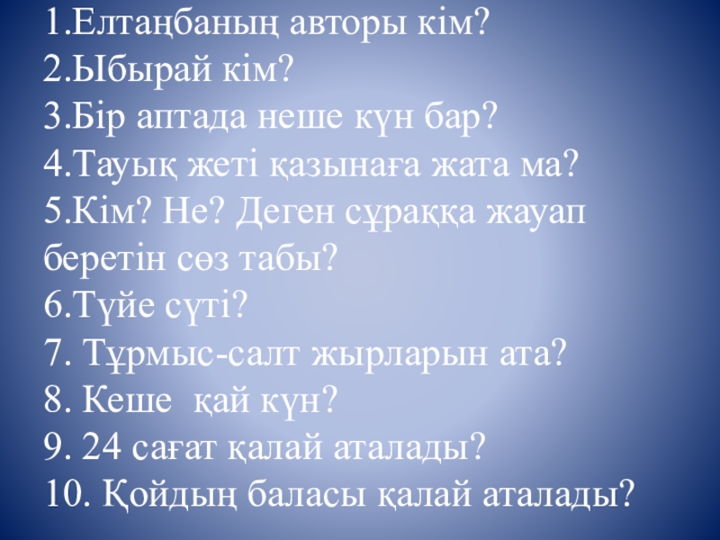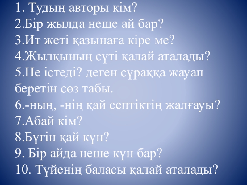 ме? 4.Жылқының сүті қалай аталады? 5.Не істеді? деген сұраққа жауап беретін сөз табы. 6.-ның, -нің қай септіктің жалғауы? 7.Абай кім? 8.Бүгін қай күн? 9. Бір айда неше күн бар? 10. Түйенің баласы қалай аталады?