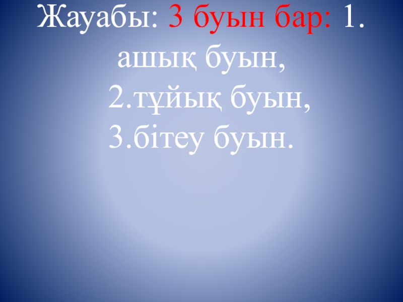 Слайд 36Жауабы: 3 буын бар: 1.ашық буын, 2.тұйық буын, 3.бітеу буын.