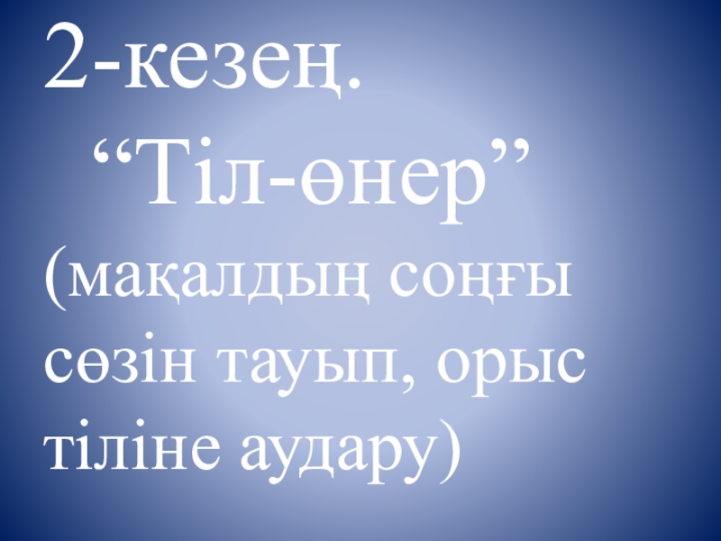 Слайд 14 2-кезең. “Тіл-өнер” (мақалдың соңғы сөзін тауып, орыс тіліне аудару)