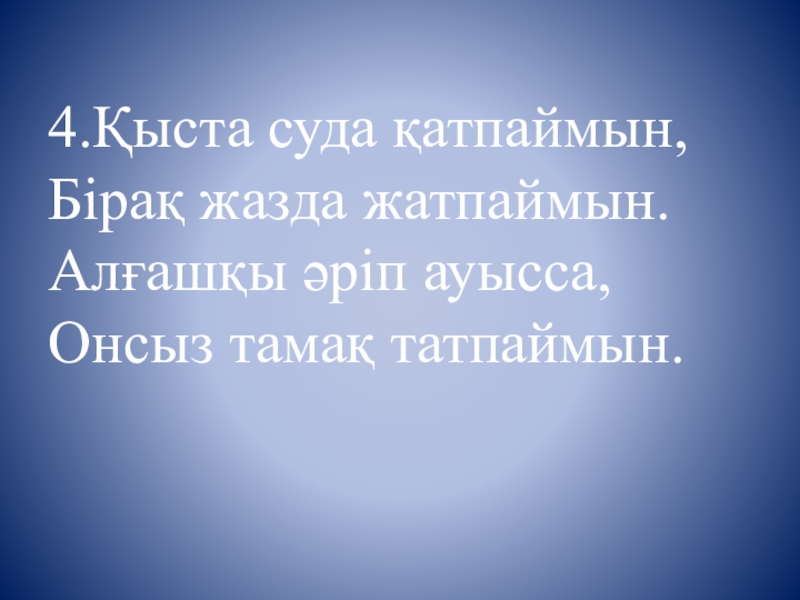 Слайд 27 4.Қыста суда қатпаймын, Бірақ жазда жатпаймын. Алғашқы әріп ауысса, Онсыз тамақ татпаймын.