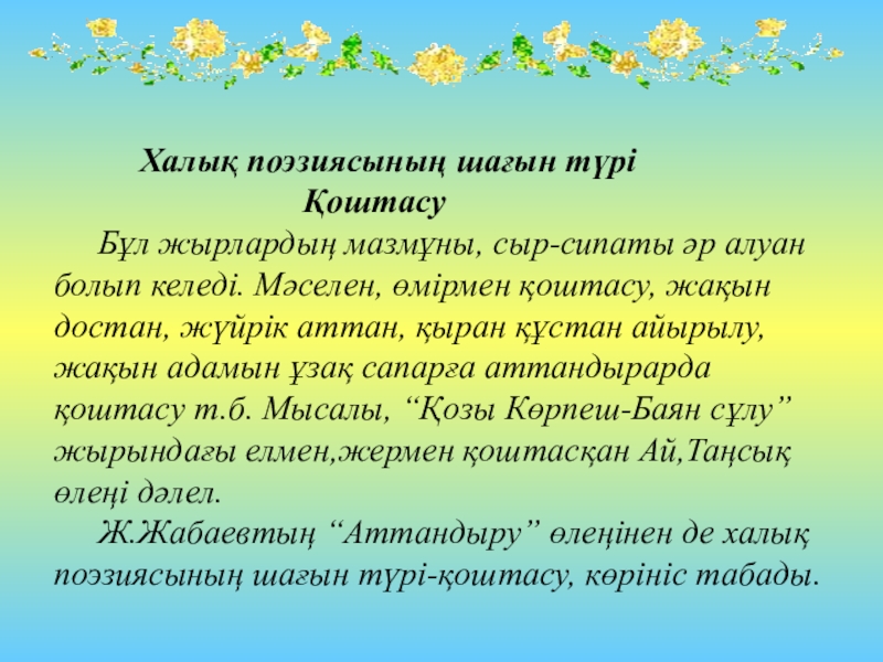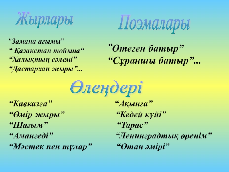 “Амангеді” “Ленинградтық өренім” “Мәстек пен тұлар” “Отан әмірі”