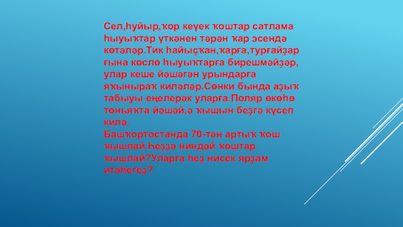 Башҡортостанда 70-тән артыҡ ҡош ҡышлай.Һеҙҙә ниндәй ҡоштар ҡышлай?Уларға һеҙ нисек ярҙам итәһегеҙ?
