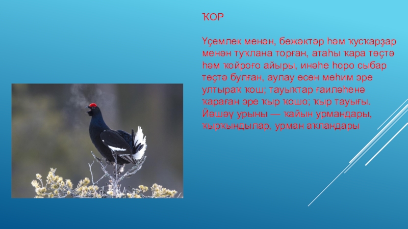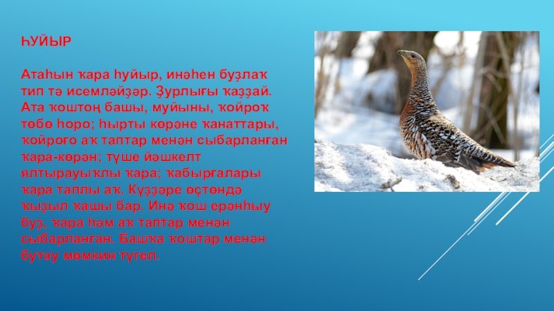 һәм ҡойроғо айыры, инәһе һоро сыбар төҫтә булған, аулау өсөн мөһим эре ултыраҡ ҡош; тауыҡтар ғаиләһенә ҡараған эре ҡыр ҡошо; ҡыр тауығы.Йәшәү урыны — ҡайын урмандары, ҡырҡындылар, урман аҡландары
