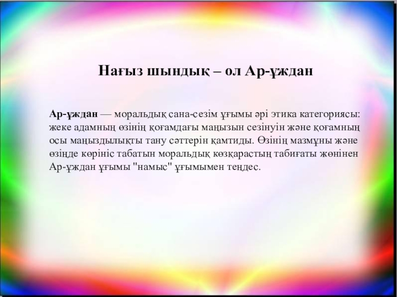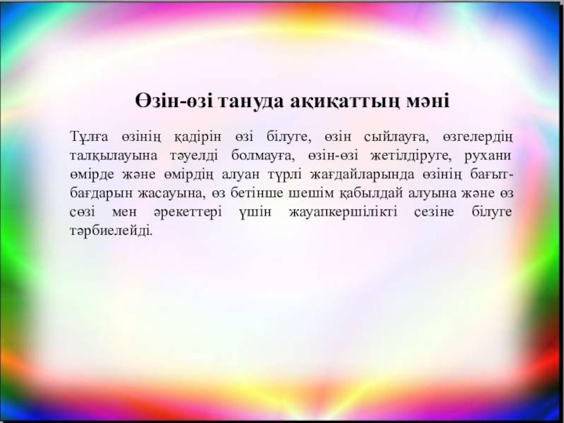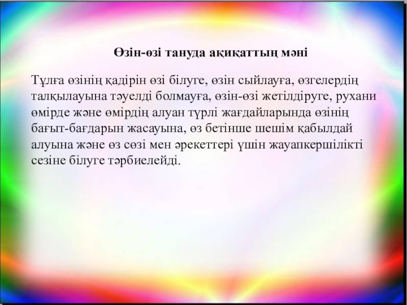 Тұлға өзінің қадірін өзі білуге, өзін сыйлауға, өзгелердің талқылауына тәуелді болмауға, өзін-өзі жетілдіруге, рухани өмірде және өмірдің алуан түрлі жағдайларында өзінің бағыт-бағдарын жасауына, өз бетінше шешім қабылдай алуына және өз сөзі мен әрекеттері үшін жауапкершілікті сезіне білуге тәрбиелейді.
