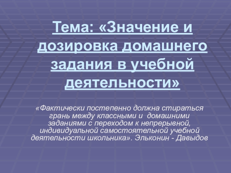 стираться грань между классными и домашними заданиями с переходом к непрерывной, индивидуальной самостоятельной учебной деятельности школьника». Эльконин - Давыдов