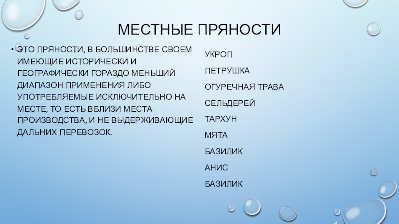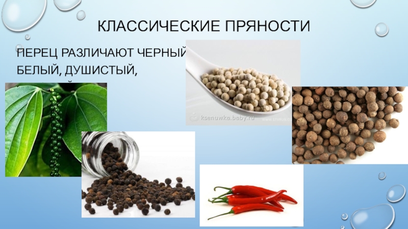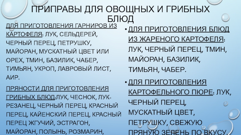Для приготовления блюд из жареного картофеля: Лук, черный перец, тмин, майоран, базилик, тимьян, чабер.