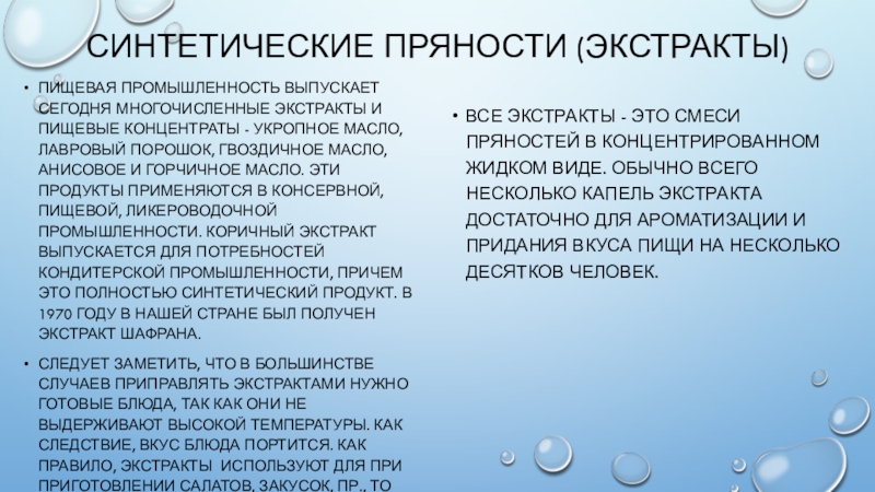 Все экстракты - это смеси пряностей в концентрированном жидком виде. Обычно всего несколько капель экстракта достаточно для ароматизации и придания вкуса пищи на несколько десятков человек.