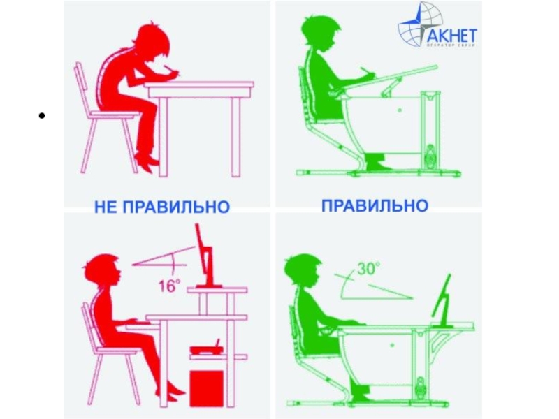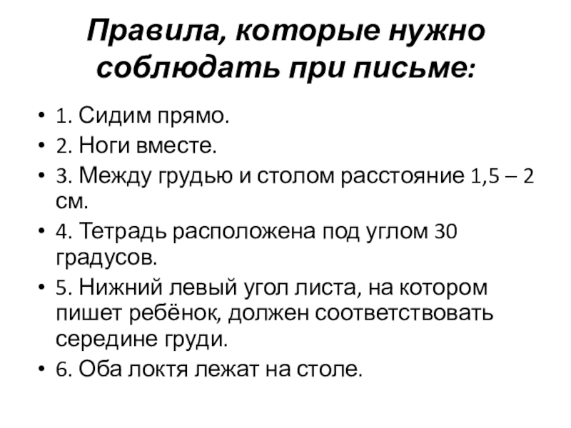 Правила, которые нужно соблюдать при письме: 1. Сидим прямо.2. Ноги вместе.3. Между грудью и столом расстояние 1,5 – 2 см.4. Тетрадь расположена под углом 30 градусов.5. Нижний левый угол листа, на котором пишет ребёнок, должен соответствовать