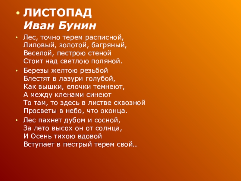 ЛИСТОПАД Иван БунинЛес, точно терем расписной, Лиловый, золотой, багряный, Веселой, пестрою стеной Стоит над светлою поляной.Березы желтою