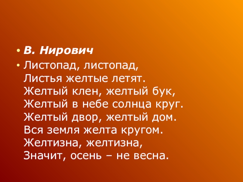 В. НировичЛистопад, листопад, Листья желтые летят. Желтый клен, желтый бук, Желтый в небе солнца круг. Желтый двор,