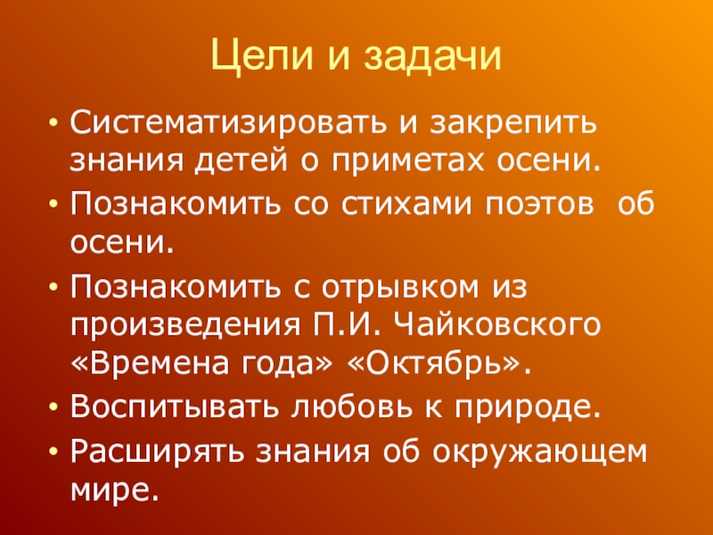 Цели и задачиСистематизировать и закрепить знания детей о приметах осени.Познакомить со стихами поэтов об осени.Познакомить с отрывком из произведения П.И. Чайковского «Времена года» «Октябрь».Воспитывать любовь к природе.Расширять знания об окружающем мире.