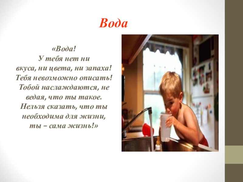 Вода«Вода! У тебя нет ни вкуса, ни цвета, ни запаха! Тебя невозможно описать! Тобой наслаждаются, не ведая,
