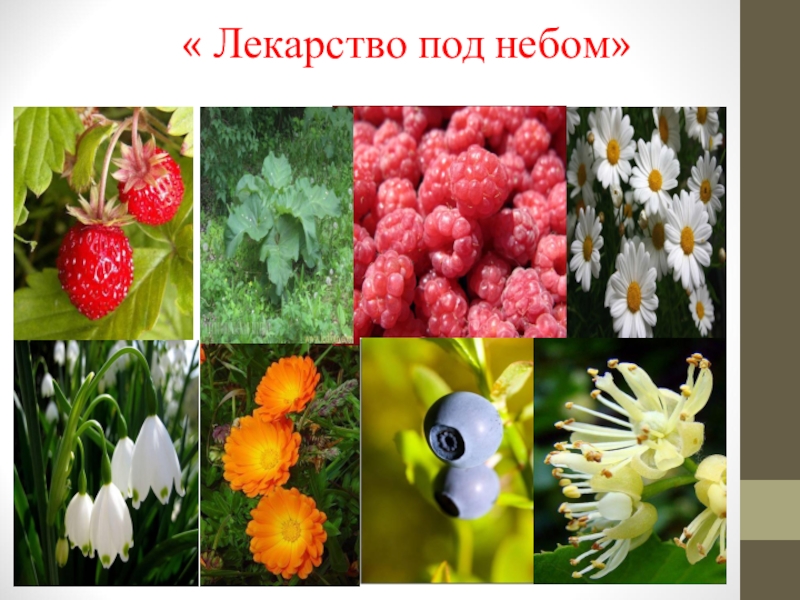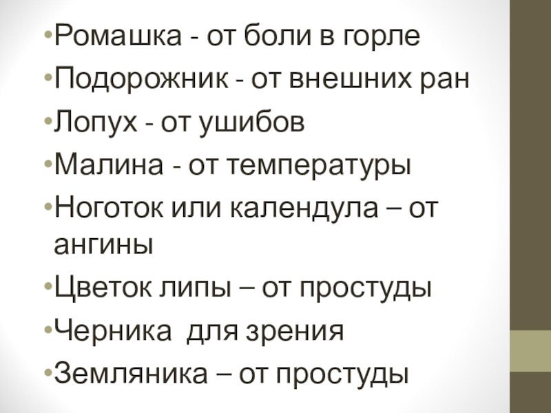 Ромашка - от боли в горлеПодорожник - от внешних ранЛопух - от ушибовМалина - от температурыНоготок или
