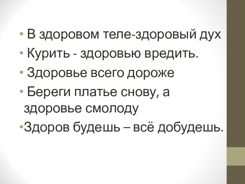 В здоровом теле-здоровый дух Курить - здоровью вредить. Здоровье всего дороже Береги платье снову, а здоровье