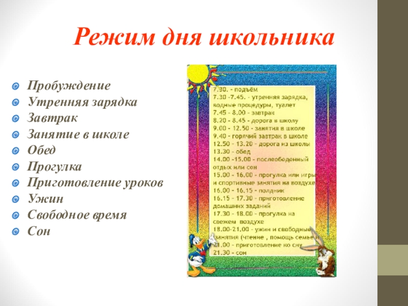 Режим дня школьникаПробуждениеУтренняя зарядкаЗавтрак Занятие в школеОбедПрогулкаПриготовление уроковУжинСвободное времяСон