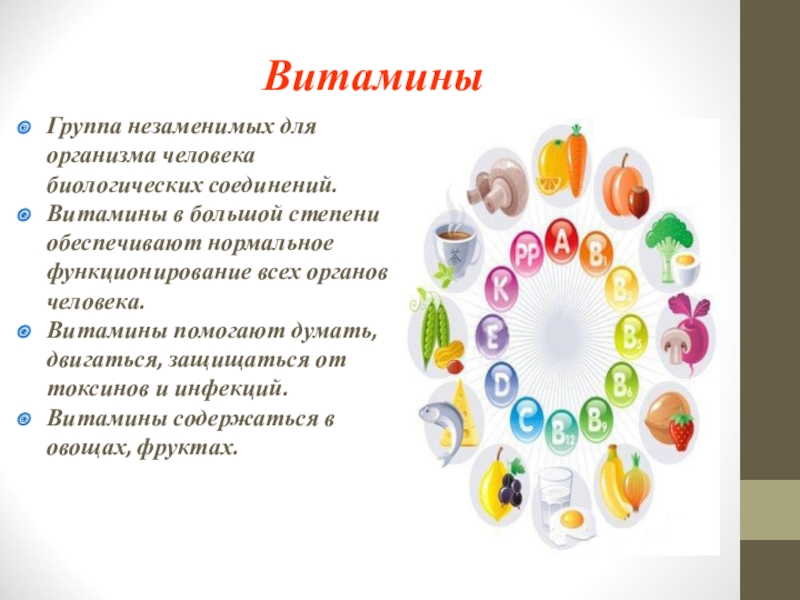 ВитаминыГруппа незаменимых для организма человека биологических соединений.Витамины в большой степени обеспечивают нормальное функционирование всех органов человека. Витамины