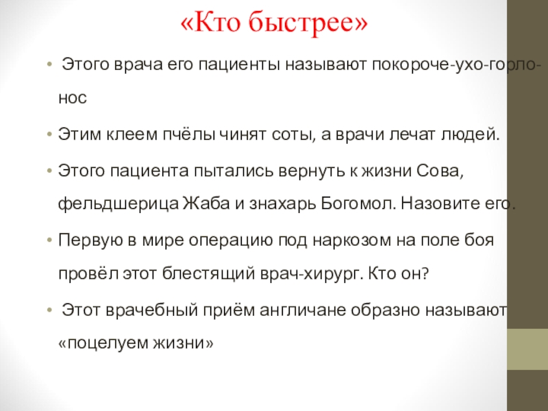 «Кто быстрее» Этого врача его пациенты называют покороче-ухо-горло-нос Этим клеем пчёлы чинят соты, а врачи лечат людей. Этого пациента пытались вернуть к жизни Сова, фельдшерица Жаба и знахарь Богомол. Назовите его. Первую в мире операцию под