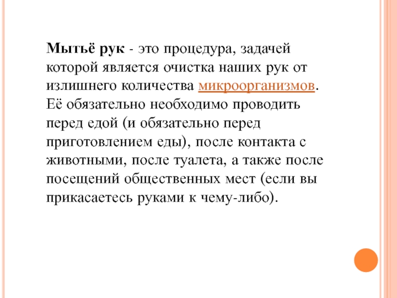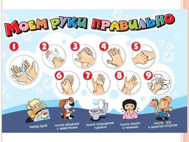 от излишнего количества микроорганизмов. Её обязательно необходимо проводить перед едой (и обязательно перед приготовлением еды), после контакта с животными, после туалета, а также после посещений общественных мест (если вы прикасаетесь руками к чему-либо).
