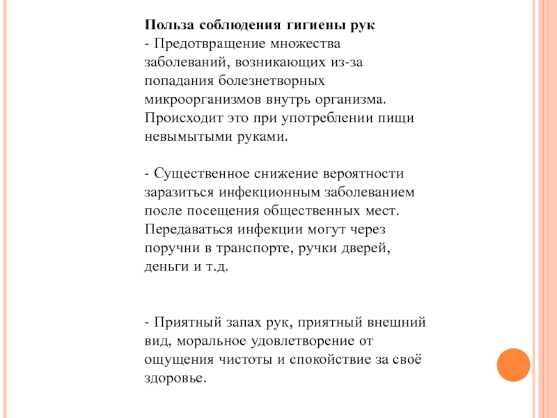 Польза соблюдения гигиены рук- Предотвращение множества заболеваний, возникающих из-за попадания болезнетворных микроорганизмов внутрь организма. Происходит это при